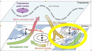 Schéma illustrant les phénomènes météorologiques étudiés pendant NAWDIC. Sont entourés en jaune les phénomènes étudiés par la composante française de la campagne