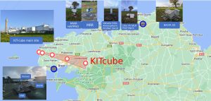 Schéma illustrant le déploiement de différents instruments sur le Finistère nord et les côtes d’Armor : l’équipe allemande du Karlsruhe Institute of Technology a mis en place 5 sites instrumentés (KITcube en rouge) tandis que l’équipe française (partenaires : LATMOS, OPGC, CNRM) a mis en place 2 sites, un à Plouzané près de Brest et un autre à Lannion.