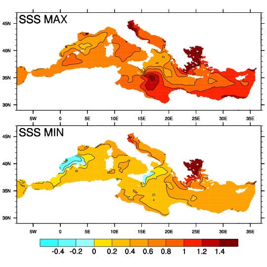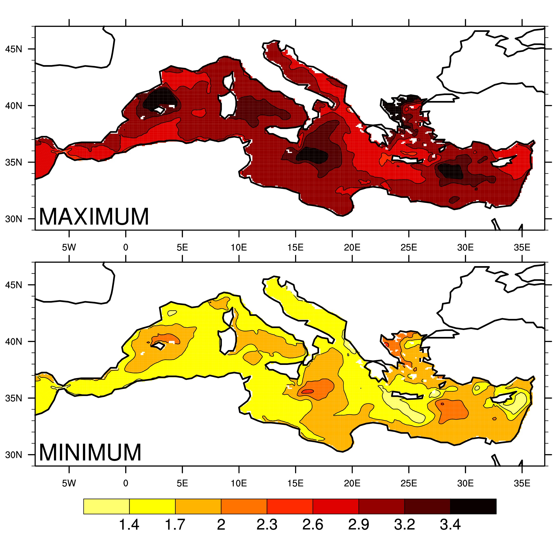 Carte du changement climatique minimal et maximal de l'ensemble multi-modèle en chaque point de grille pour la température de surface de la me à la fin du 21ème siècle en comparaison avec la fin du 20ème siècle.La Méditerranée figure parmi les « hot-spots » du changement climatique : les effets attendus y sont particulièrement importants, et les impacts environnementaux et socio-économiques risquent d’y être très prononcés. Toutefois, les effets locaux y étaient jusqu’à présent imparfaitement décrits, notamment en raison d’un manque de simulations océaniques à échelle fine.