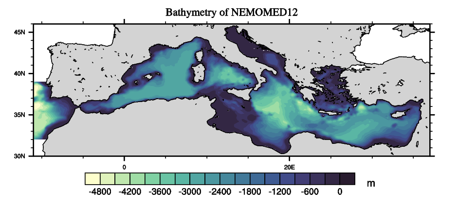Le modèle NEMOMED12 est une version régionale sur la Méditerranée du modèle NEMO-V3.6 (Madec et al., 2016). La grille du modèle est une extraction de la grille globale ORCA 1/12°. La bathymétrie est décrite dans la documentation technique à retrouver ici.