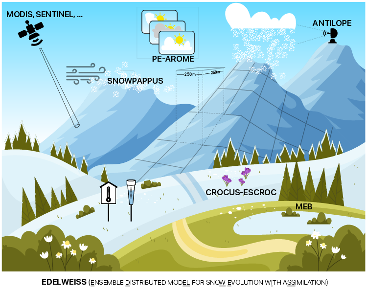 - Météorologie de Montagne et descente d’échelle : Cette activité comprend l’utilisation et l’évaluation des modèles de Prévision Numérique du Temps (notamment AROME / Prévision d’Ensemble-AROME) pour la simulation des conditions météorologiques et du manteau neigeux en zone de montagne, les travaux menés pour descendre en échelle des forçages météorologiques jusqu’à la résolution spatiale cible d’EDELWEISS (250 m).