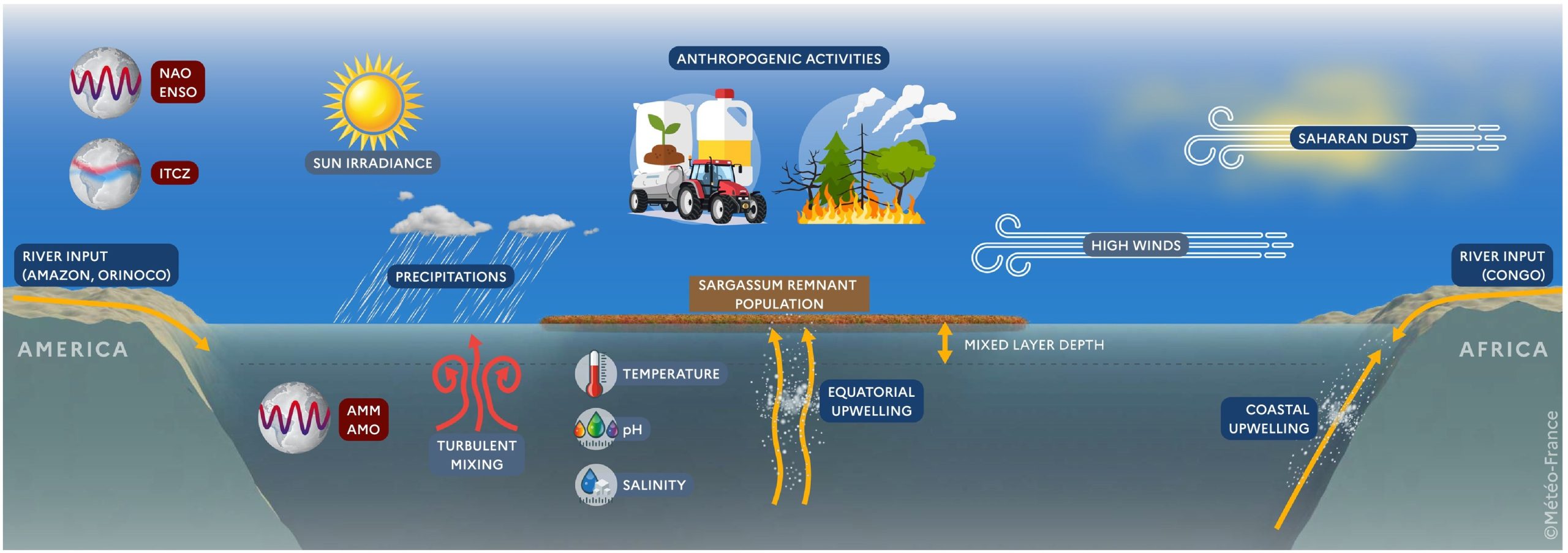 The proliferation of large sargassum rafts and their accumulation along the coastlines of the Caribbean region and the West African coast has arisen in 2011. Despite a notable interannual variability, this system shift in the tropical Atlantic ocean is increasing (Jouanno et al, 2023).